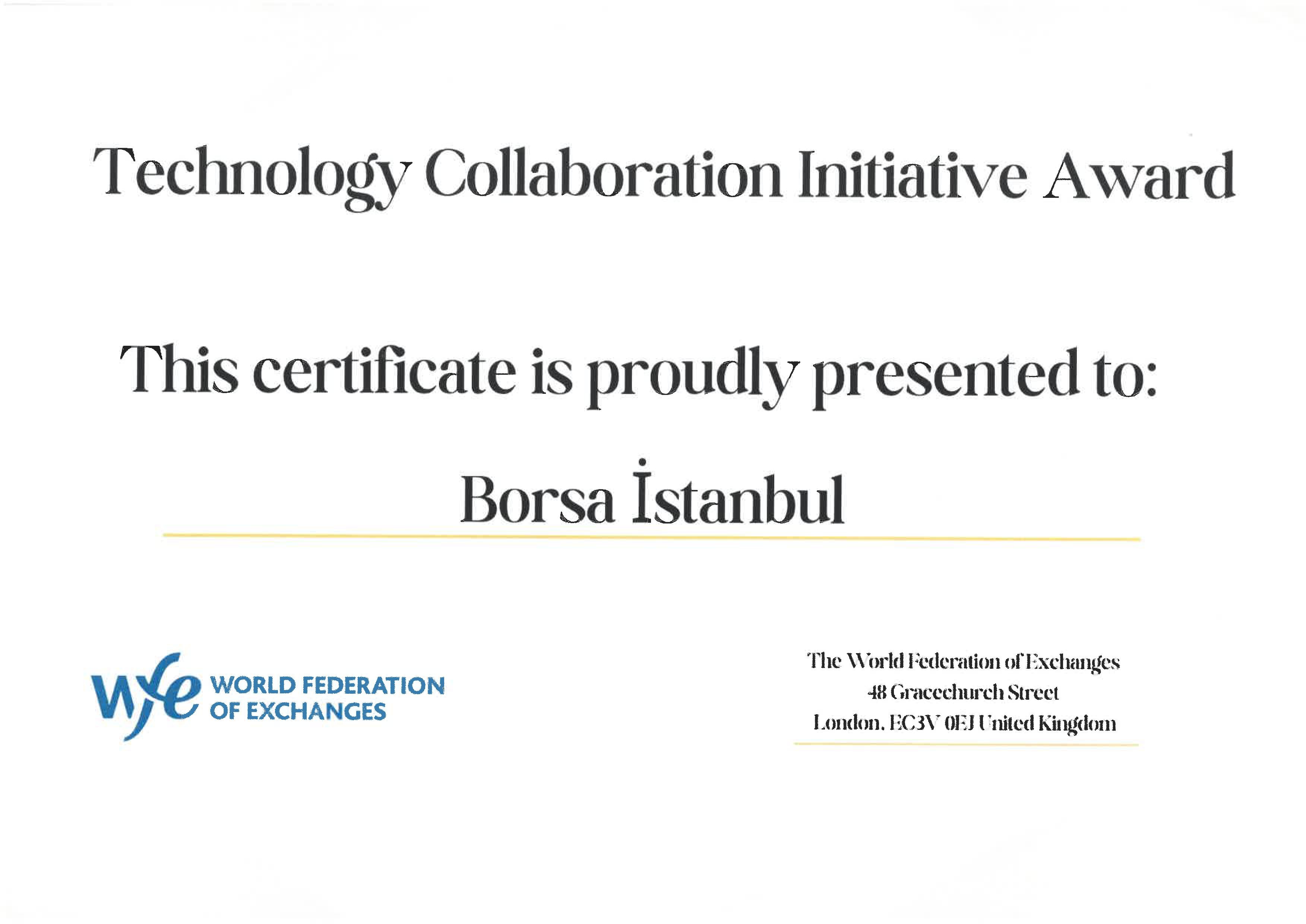 Borsa İstanbul, Dünya Borsalar Federasyonu tarafından verilen Teknoloji İş Birliği Girişimi (Technology Collaboration Initiative) ödülüne layık görülmüştür. Bu ödül, Borsa İstanbul’un teknoloji ihracına yönelik atılımlarını ve başarılarını vurgularken aynı zamanda teknoloji alanında diğer borsalar ile yaptığı iş birliklerinin ve bu borsaların gelişimine yaptığı katkıların altını çizmektedir.